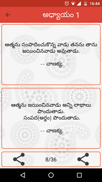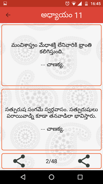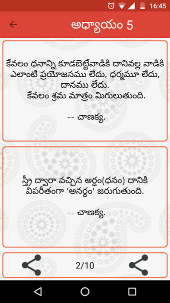 Chanakya Niti Telugu to aplikacja na Androida stworzona przez Sudhakara Muttineni, która oferuje zbiór Chanakya Niti Vakyalu, Sutralu i cytatów słynnego pandita Chanaky. Ta aplikacja jest doskonałym narzędziem dla tych, którzy szukają porad i mądrości od starożytnego indyjskiego filozofa. Aplikacja jest podzielona na tematy takie jak życie, praca, pieniądze, żona, król, kraj, mądrość, zasady, prawda, miłość, przyjaźń, mężczyzna i kobieta.